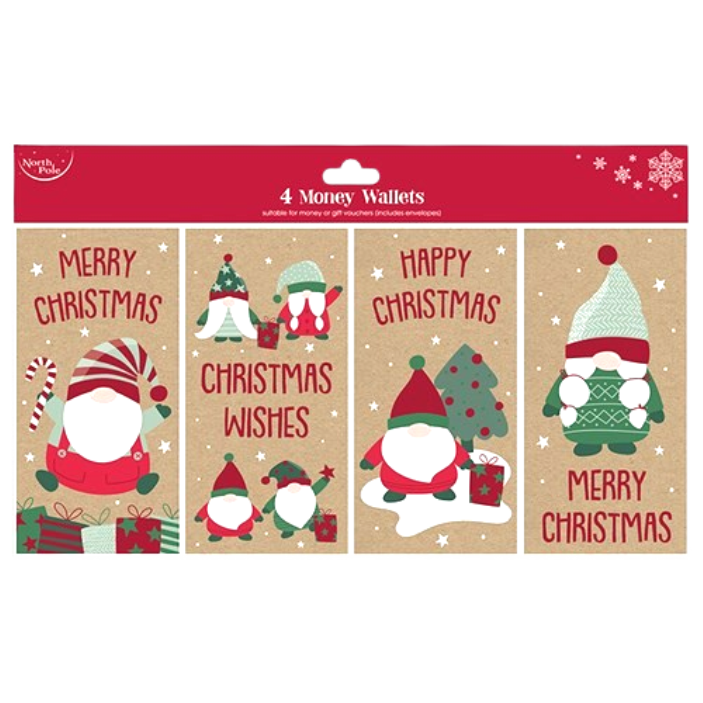 Pack of four Kraft Christmas money wallets, one of each design