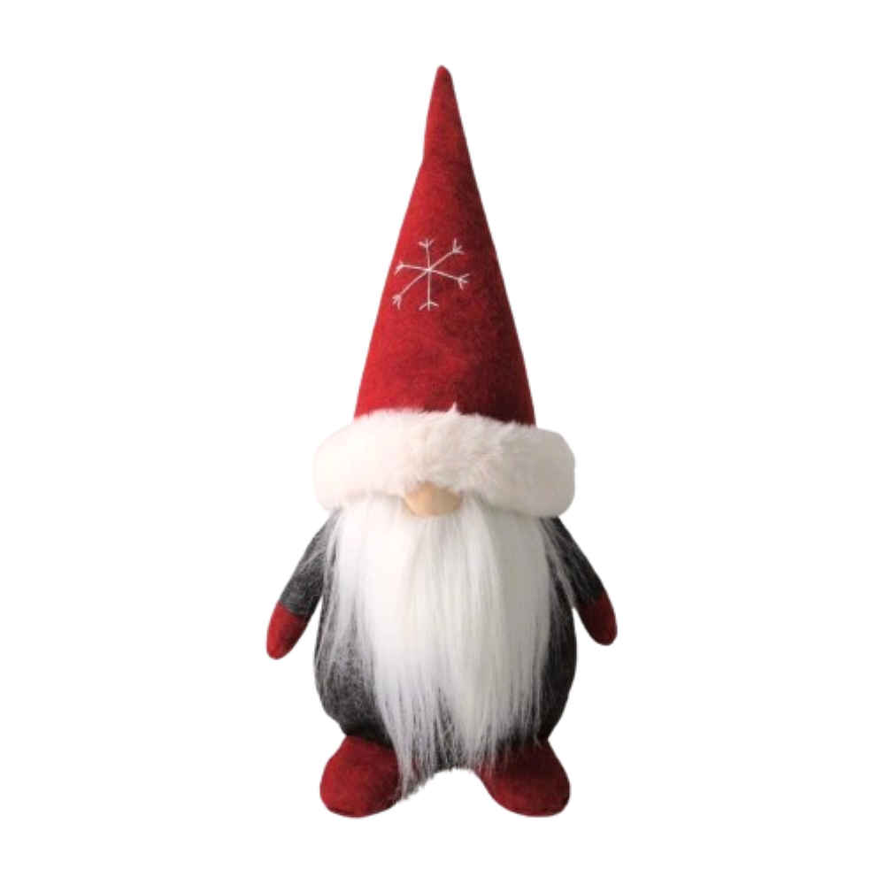 Lovely red and grey gonk Christmas plush ornament with snowflake on his hat.